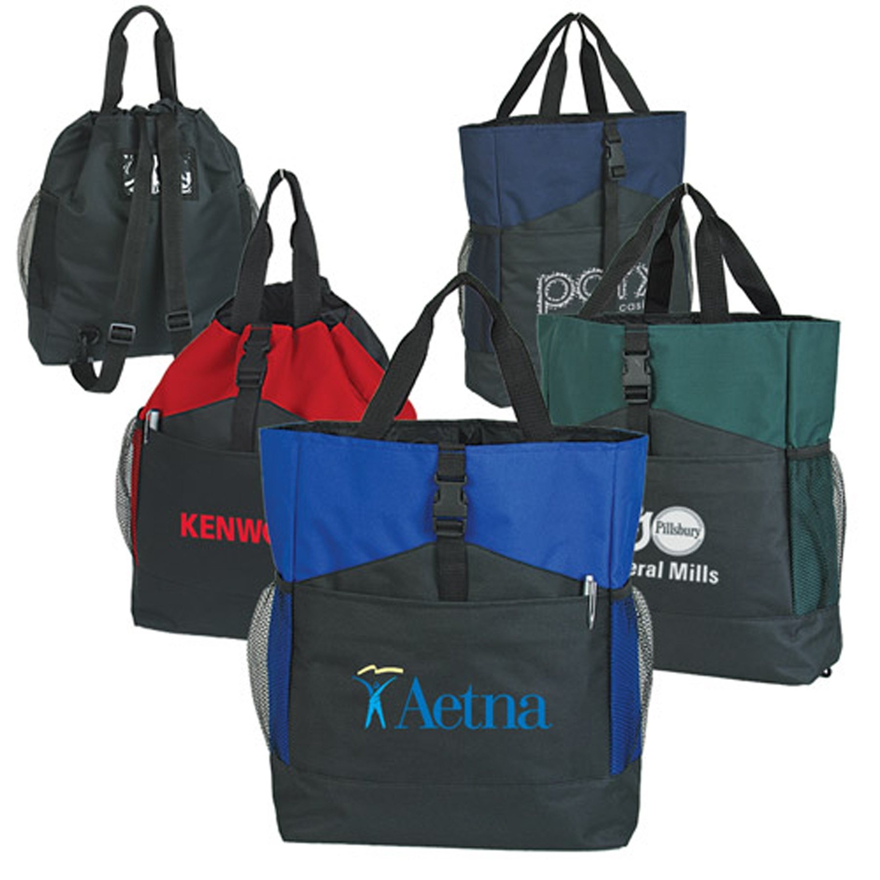 - A pair of adjustable shoulder straps can convert this tote bag to a backpack.