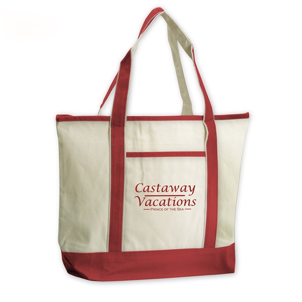 - 12 oz cotton canvas, two-tone, boat tote bag featuring a main compartment with an 8" x 5" interior zippered pocket and front pocket.