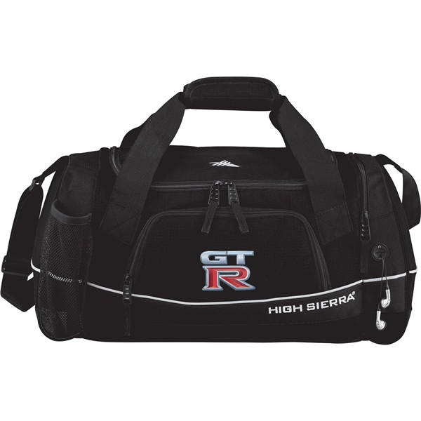 - The High Sierra Bubba Duffel bag includes a large main compartment with U-shaped zippered opening and a zippered end pocket with a media pocket and headphone port.