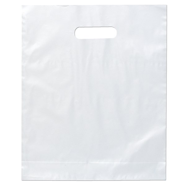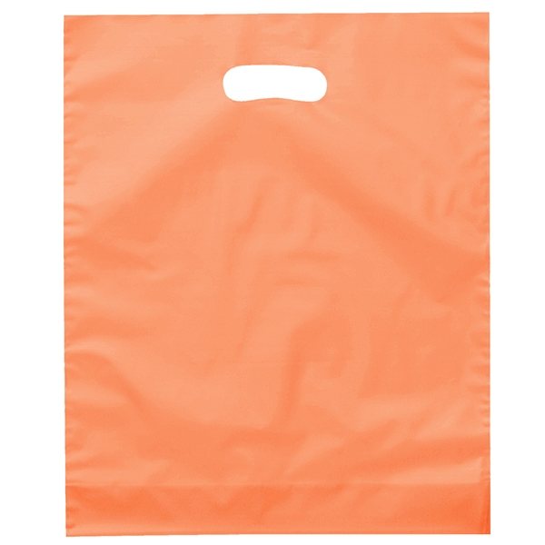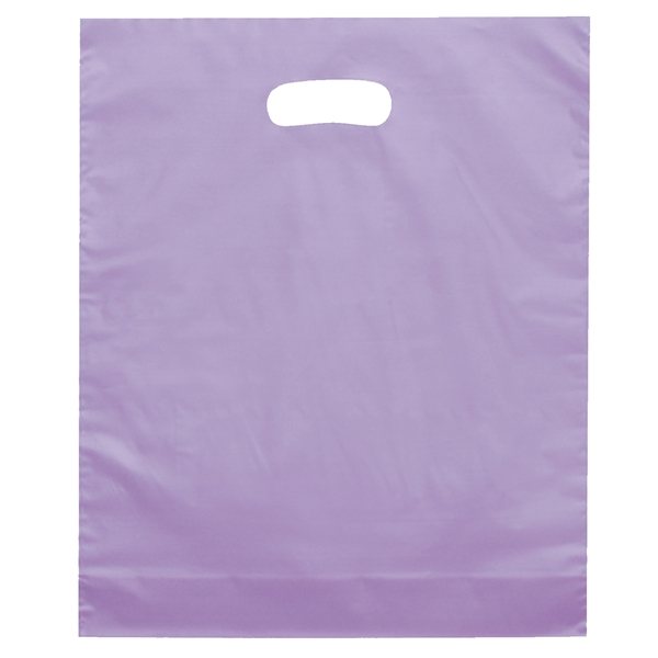 - Colorful frosted hi-density plastic bag features die cut handles and a bottom gusset.