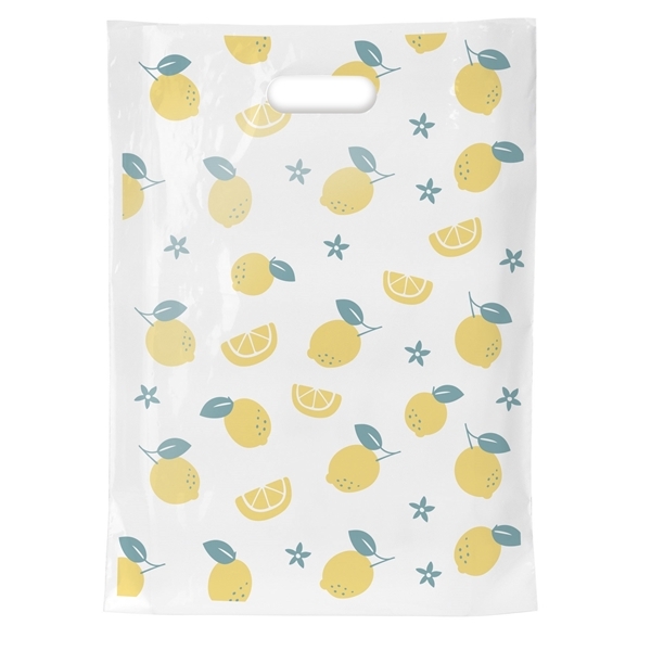 - The 12W x 16 1/2H x 3 Digital Full Color Die Cut Bag is made with 2.0 mil plastic, non-reinforced die cut handles, and a bottom gusset for more storage space.
