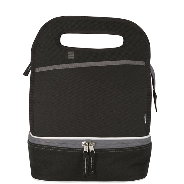 - Perfect for a lunch on the go, this cooler features multiple storage areas. The bottom opens to reveal a large insulated area, while the handles open to reveal a zippered main storage area. A front slip pocket provides added storage for condiments.