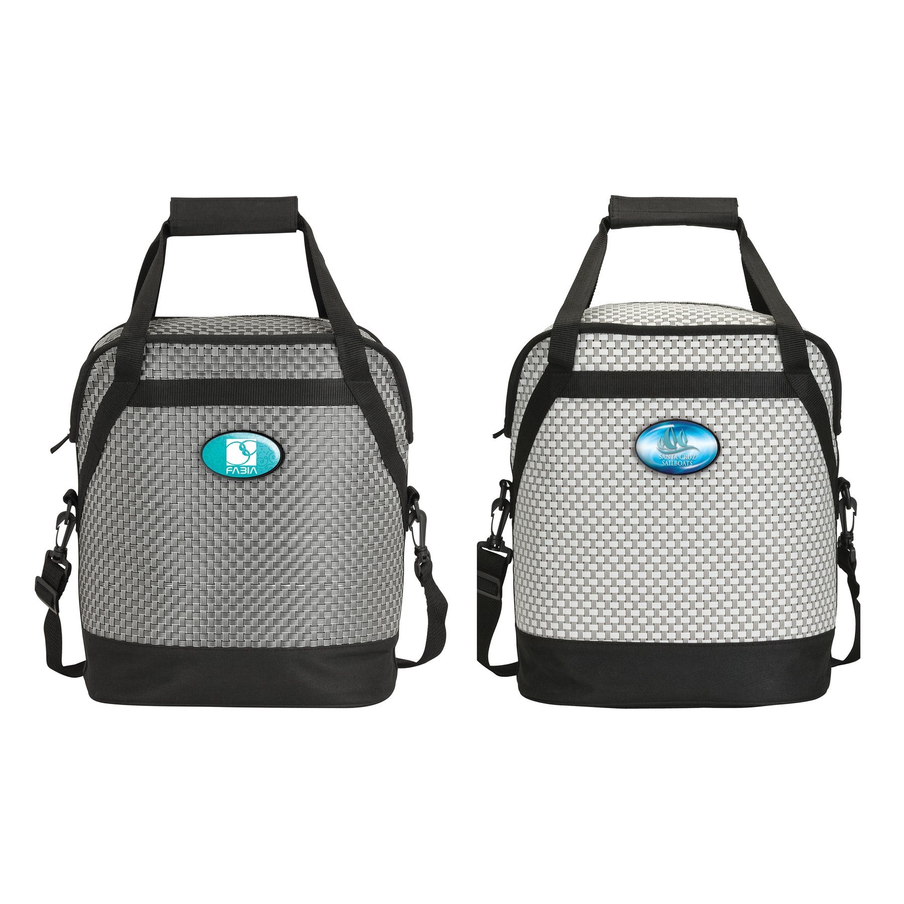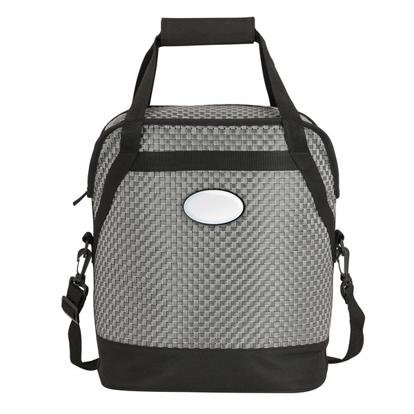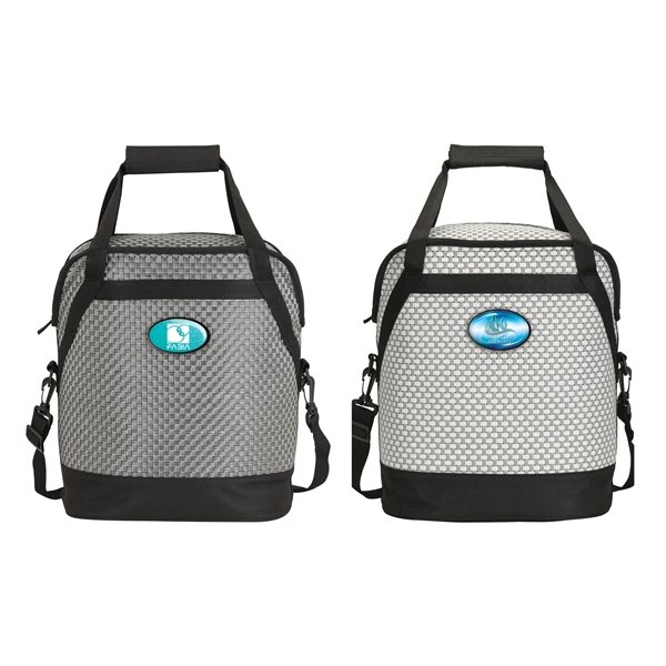 - 20-can cooler with woven poly mesh fabric and black trim, zippered main compartment with heat-sealed PEVA lining, carry handles with hook and loop pad, 1 1/2" x 46 1/2" removable and adjustable shoulder strap.