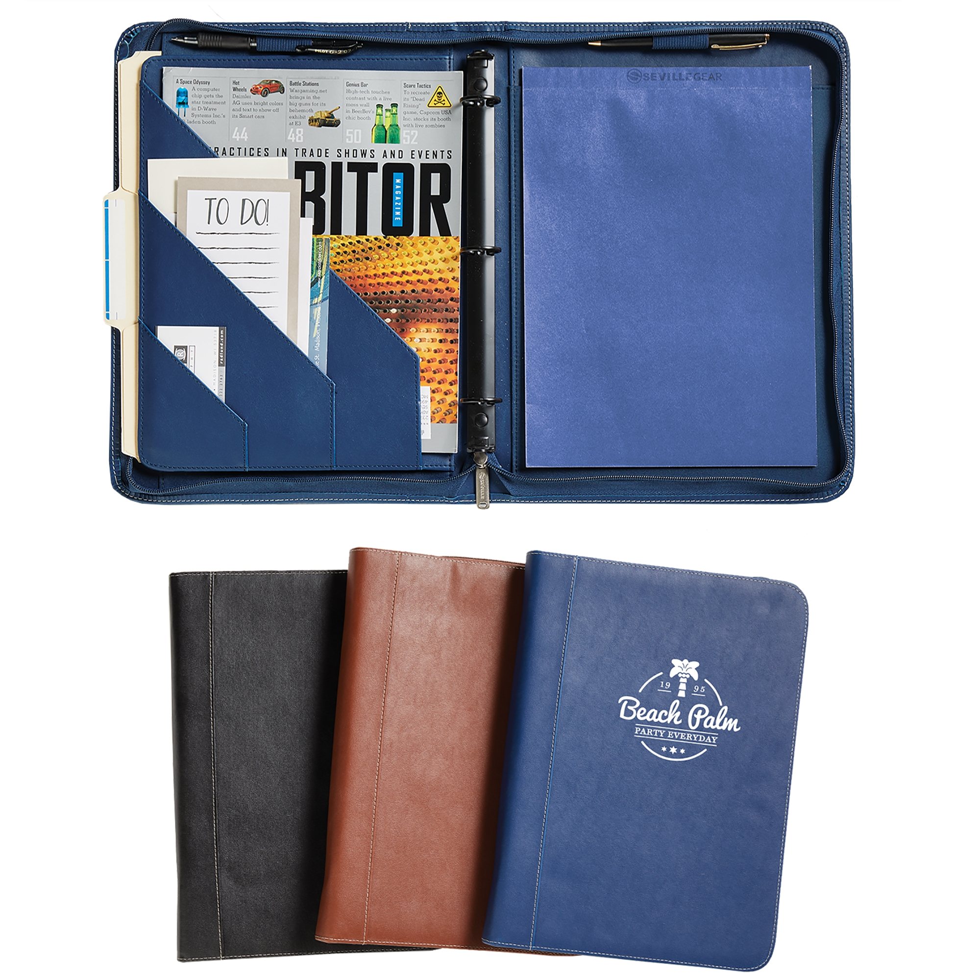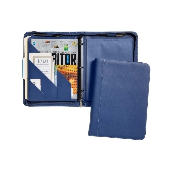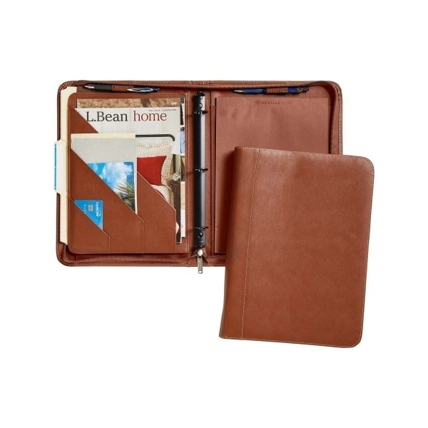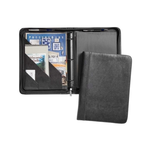 - Interior section features gusseted file pocket that easily fits a full-size tablet, three additional slant pockets, and two wide-body penholders