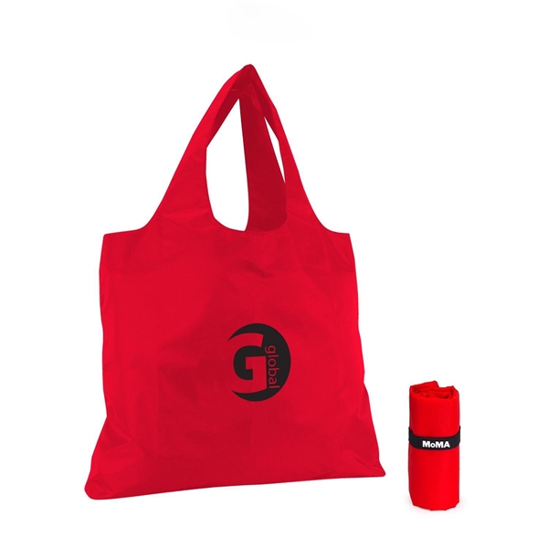 - Reusable nylon fold-up tote with elastic loop closure and molded rubber MoMA logo tag.