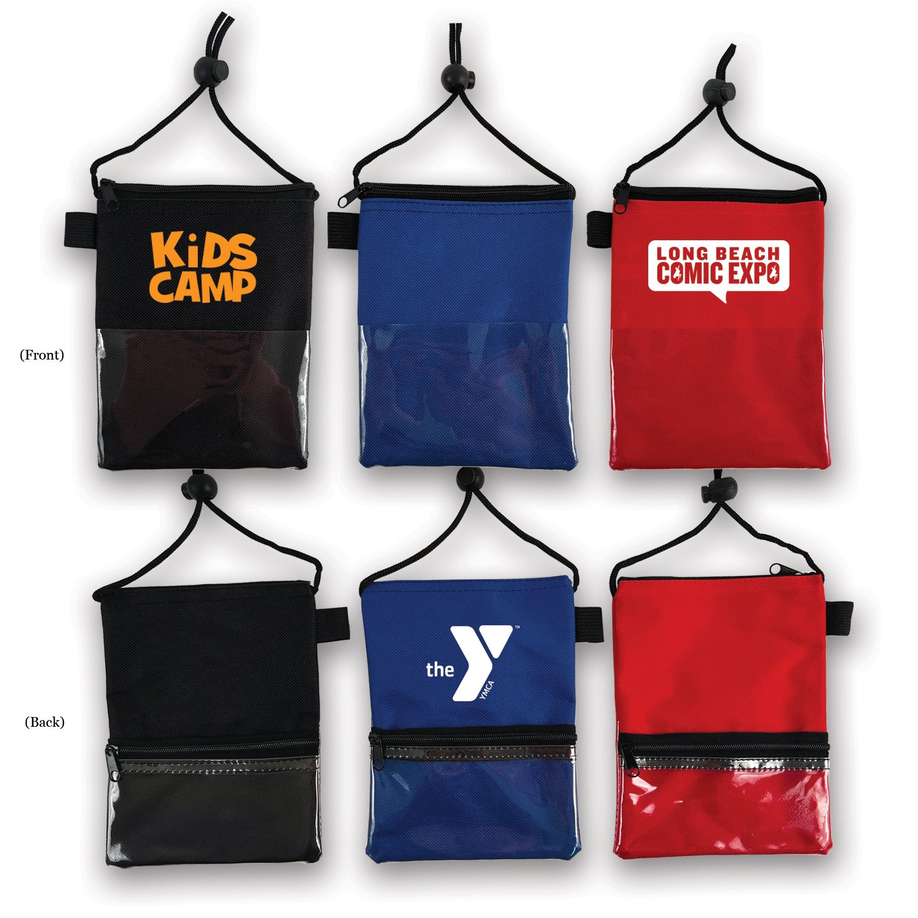 - Neck wallet with pen loop, zippered top pocket, clear front pocket and zippered back pocket for business cards or others.
