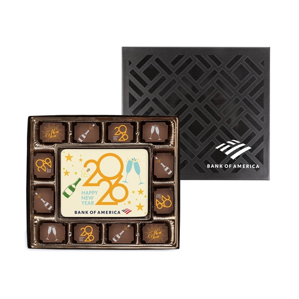 - Ring in the New Year with this delicious chocolate gift box! Includes 12 stock New Years themed chocolate pieces surrounding a creamy milk or dark chocolate customizable centerpiece.