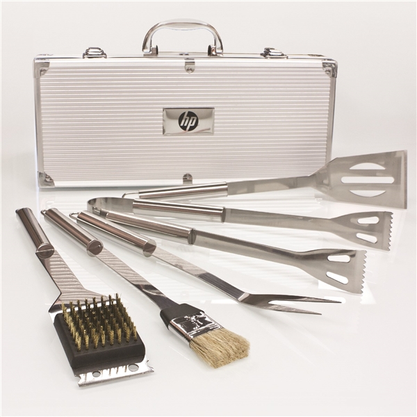 - BBQ set includes a spatula, fork, tongs, basting brush, grill brush, and heavy duty aluminum carrying case.