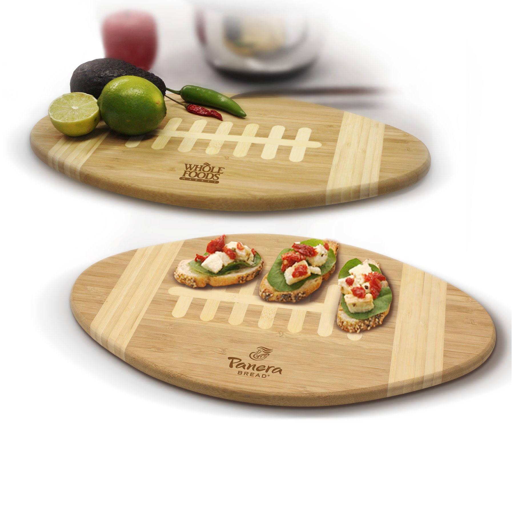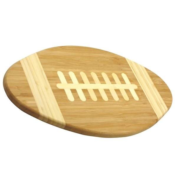 - Two-tone football shaped bamboo cutting board and serving tray made from eco-friendly bamboo.