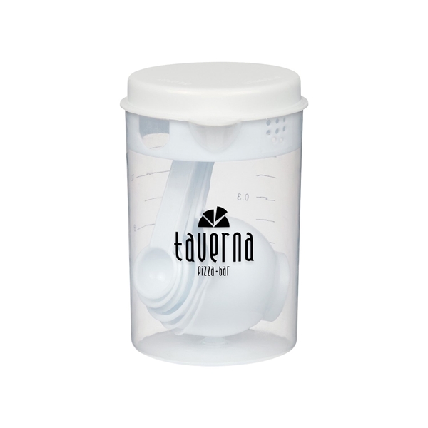 - The container it comes in measures up to 2 cups (with oz and ltr markings) and includes a lid with closed, strain and pour options.