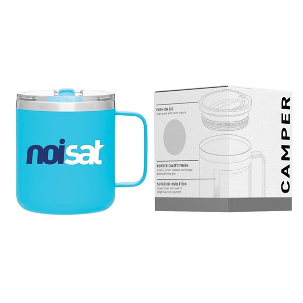- 12 oz double wall 18/8 stainless steel thermal mug with copper vacuum insulation, clear push-on lid, matching swivel closure, stainless steel rim, and powder coated finish · gift box included
