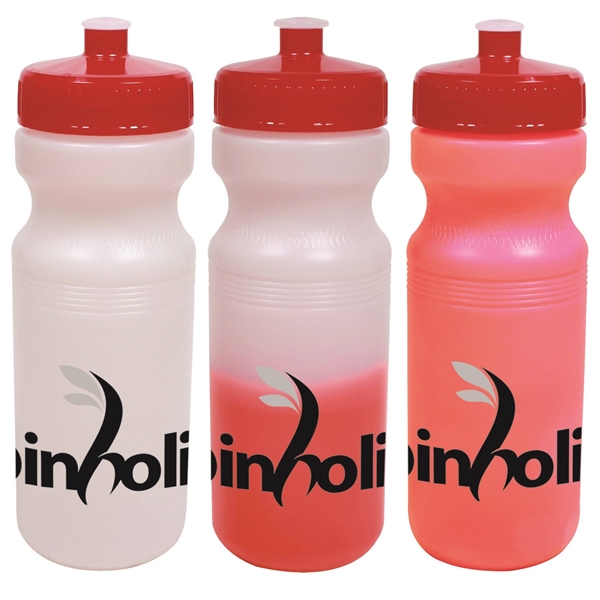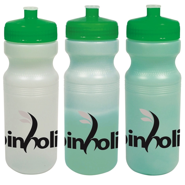 - 24 oz bike bottle changes color when you add refrigerated water.