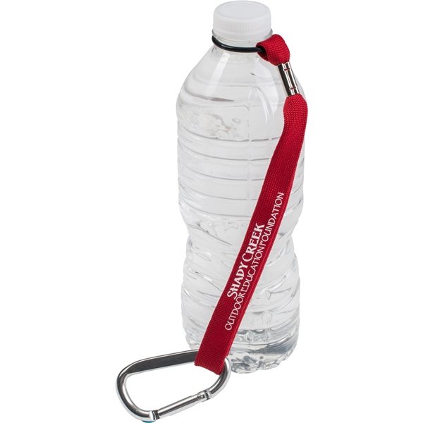 - 5/8" W two-ply polyester strap with carabiner hook and rubber O-ring bottle holder.