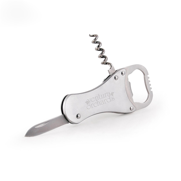 About this Promotional 4- Function Stainless Steel Corkscrew, Knife, Foil Cutter, Bottle Opener Wine Tool: