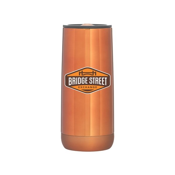 - 16.9 oz double wall 18/8 stainless steel tumbler with vacuum insulation, push-on lid, matching magnetic swivel closure, and rubberized base