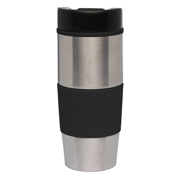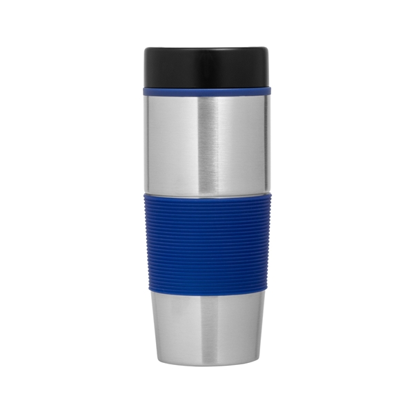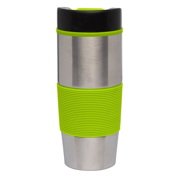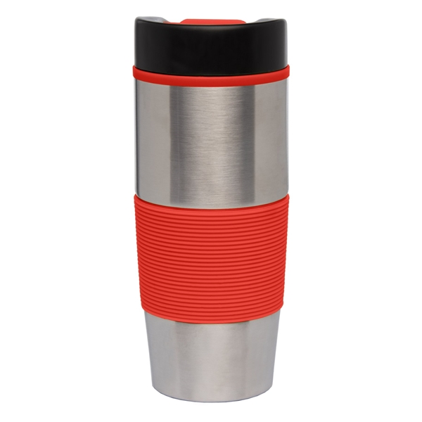 - This stainless steel tumbler features a colorful ergonomic silicone grip on the exterior and a matching plastic liner on the interior.