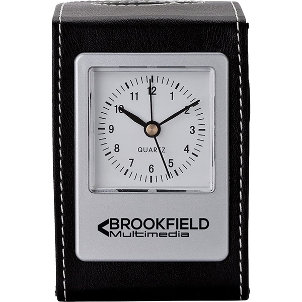 - Leatherette desktop alarm analog clock with pen cup features white contrast stitching.