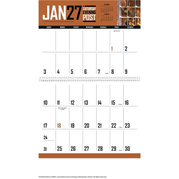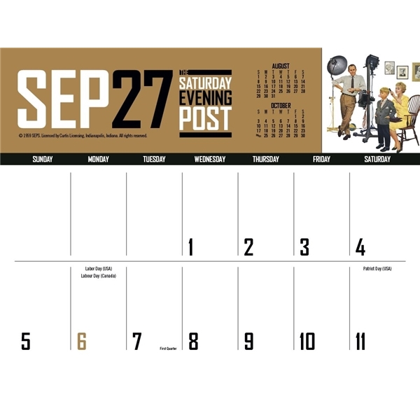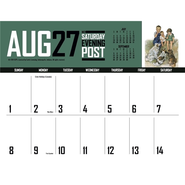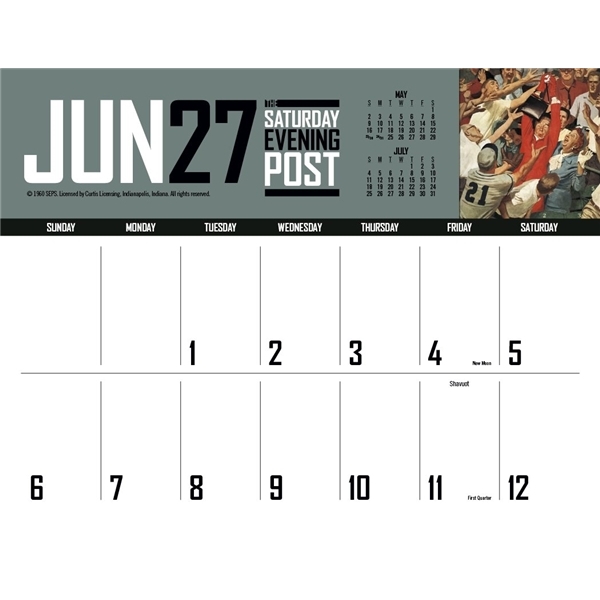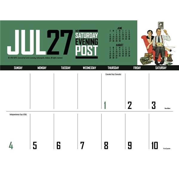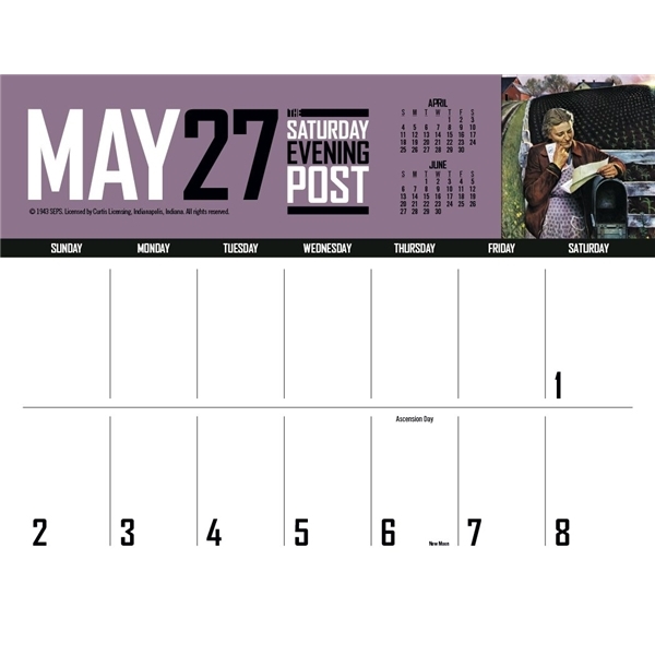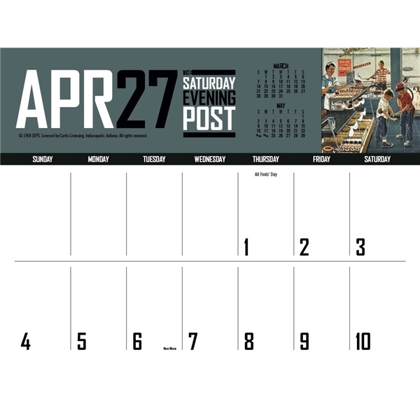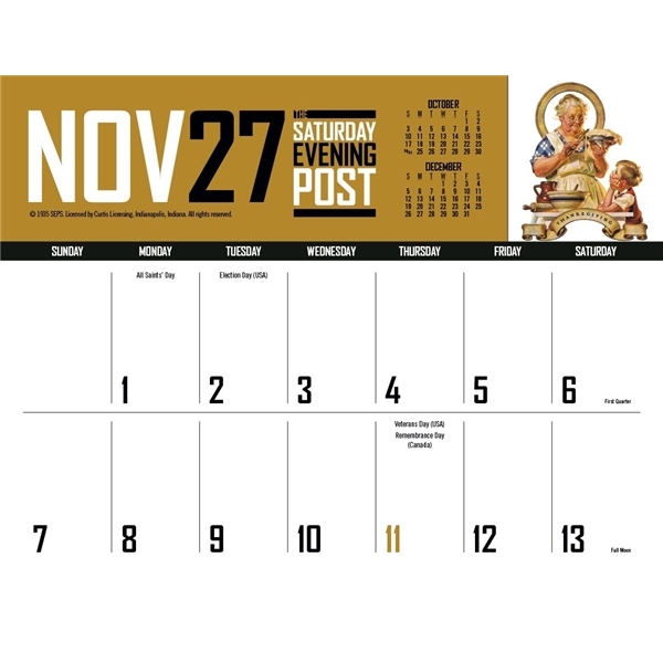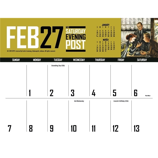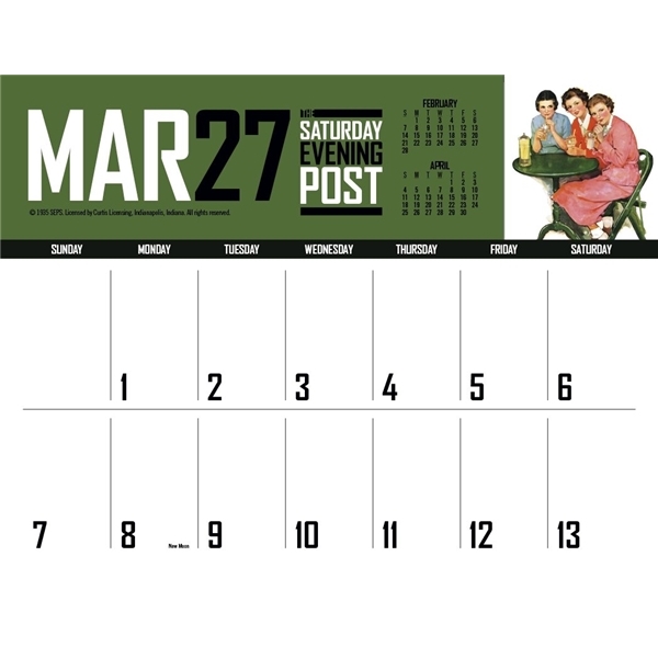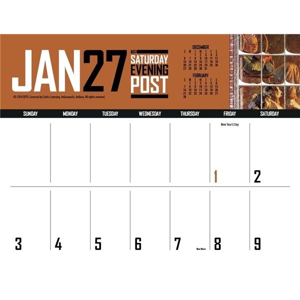 - This calendar has big bold numbers, plenty of writing space and the nostalgic artwork from The Saturday Evening Post magazine. The FSC® label means that the materials used for this product come from well-managed FSC®-certified forests and other controlled sources.