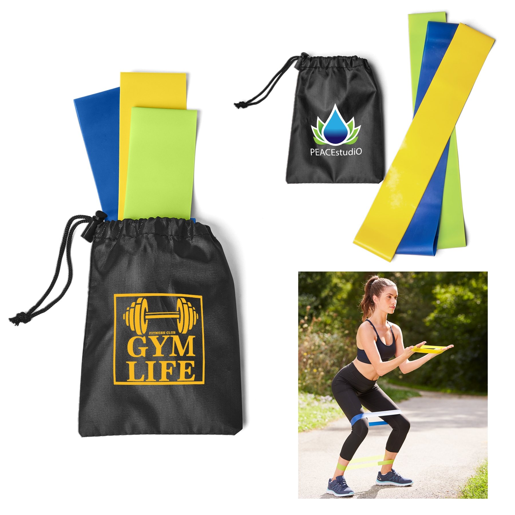 - Drawstring pouch contains three-resistance bands