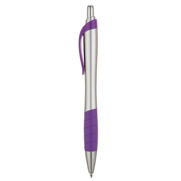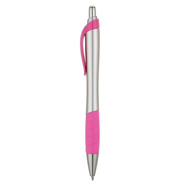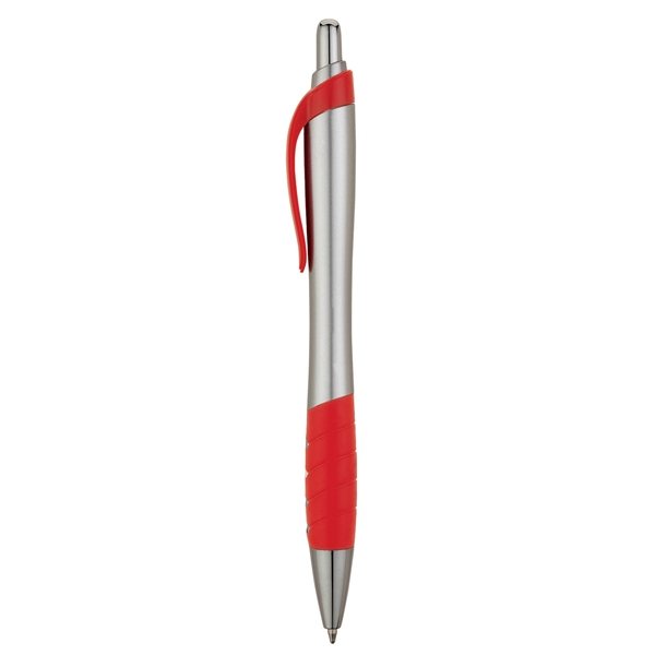 - Plunge-action ballpoint has a matte silver hourglass-shaped barrel design, colored clip, matching rubber grip and chrome trims.