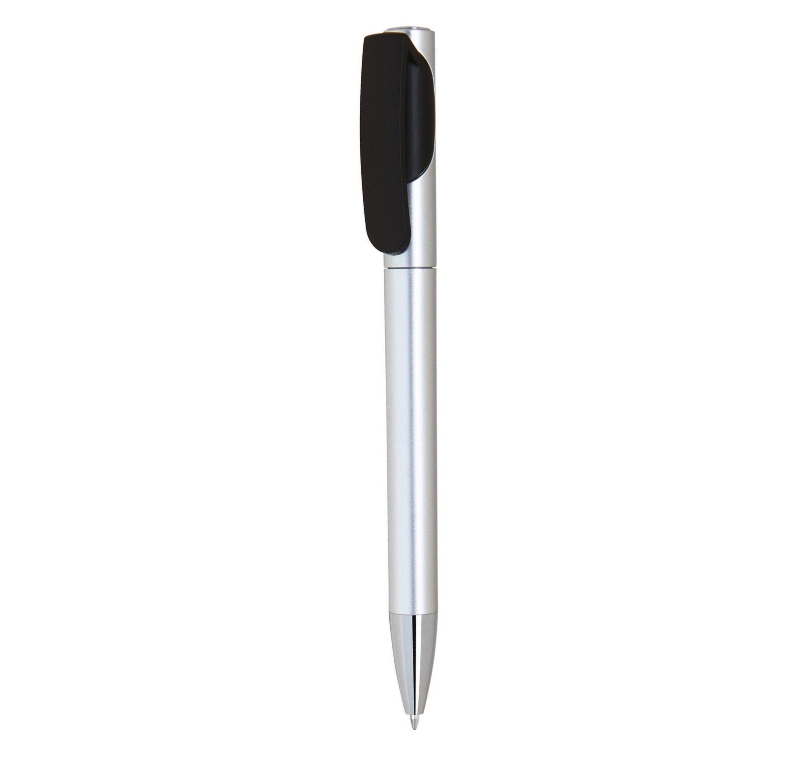 - Economical plastic pen in silver with colored trim on clip.