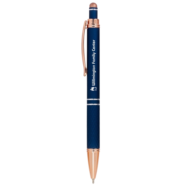 When it comes to leaving a lasting impression, this Soft Touch Pen with Stylus and Gel-Glide™ Ink is your secret weapon. Imagine offering a piece of sheer elegance to your clients and partners, featuring our exclusive Softex™ Luster finish that is all about comfort and style. You will love how this pen feels in your hand, and the rose gold accents elevate its look beyond ordinary stationery.