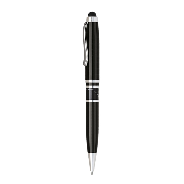 - Twist-action brass ballpoint and stylus, high-gloss lacquer barrel, black agate resin center band, polished chrome points and trim.