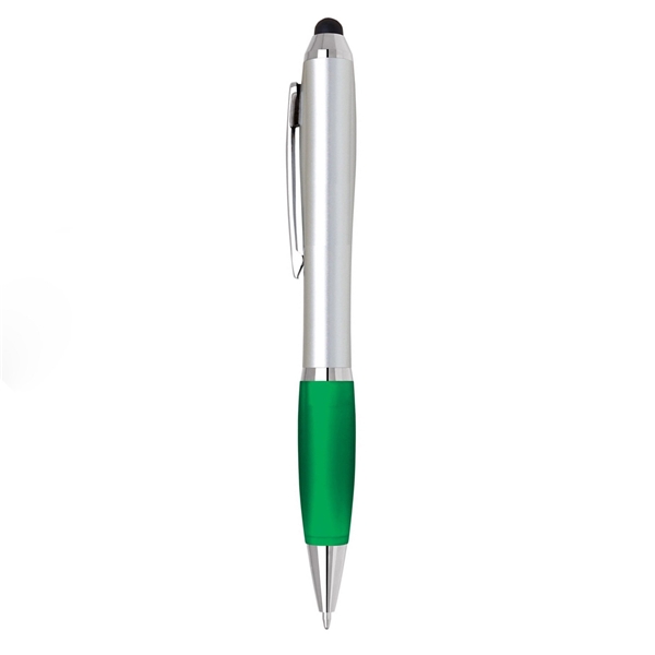 - Twist-action plastic stylus ballpoint pen with colored grip, matte finish and polished chrome points.