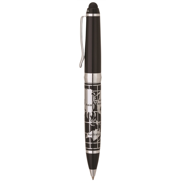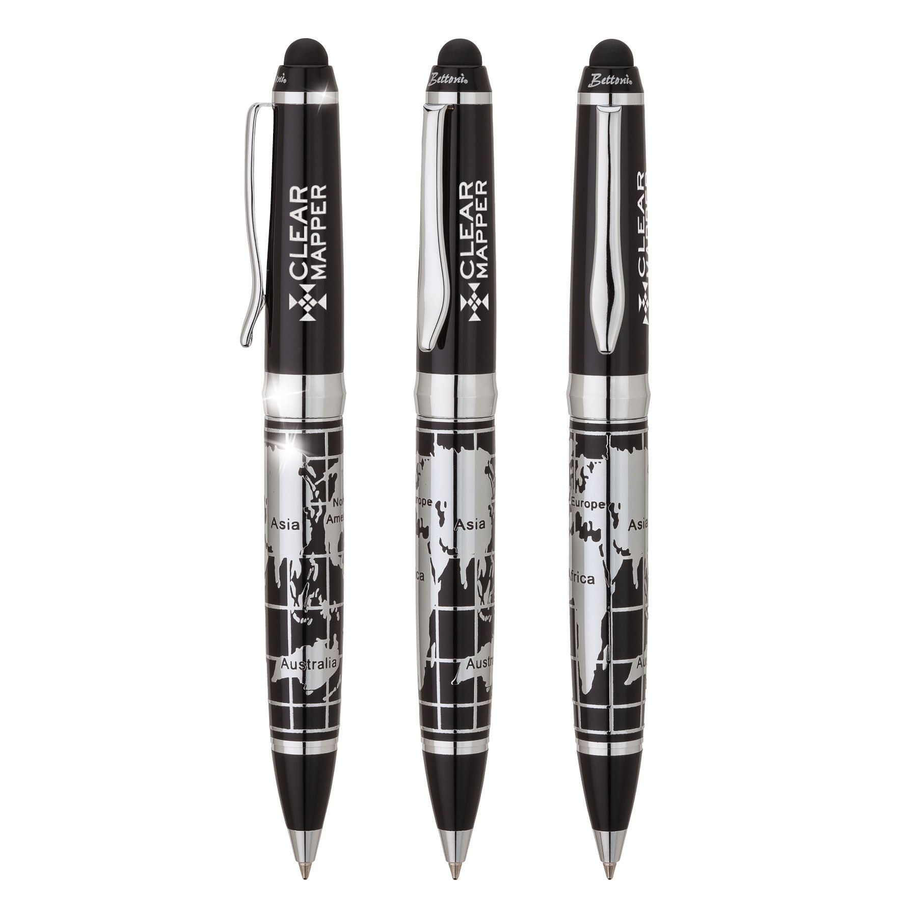 - Elegant heavyweight brass ballpoint with twist-action mechanism, a capacitive stylus, a chrome world map barrel, high gloss lacquer finish and chrome trim.