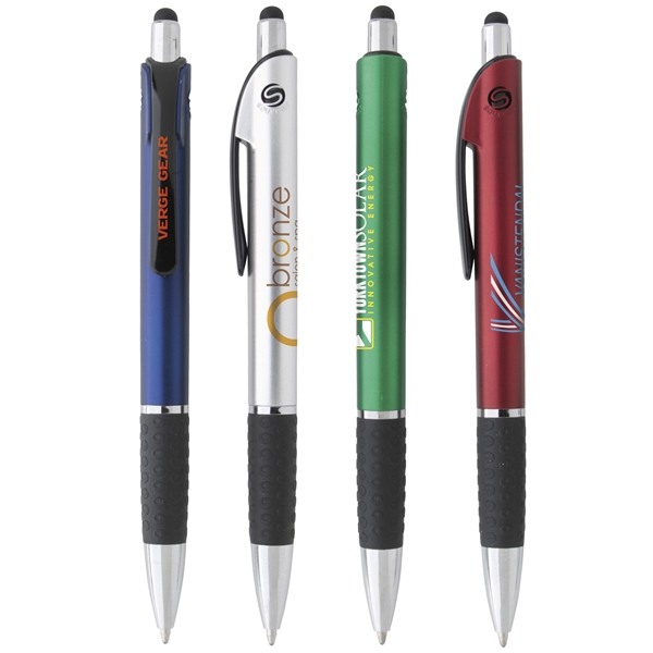 - The Souvenir® icon is cut out of this pen's metallic barrel, revealing a pop of color that coordinates with the clip. A comfortable grip and capacitive screen stylus on the plunger make this a versatile writing instrument.