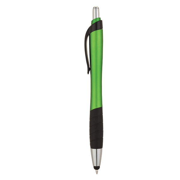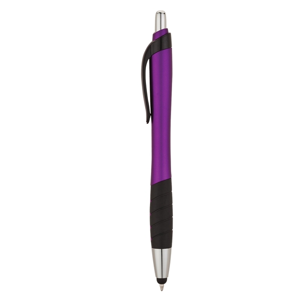 - Plunge-action ballpoint pen features a metallic color barrel, black clip, black rubber grip with four matching color oval accents, chrome trims and a capacitive stylus that works with touch screen devices.