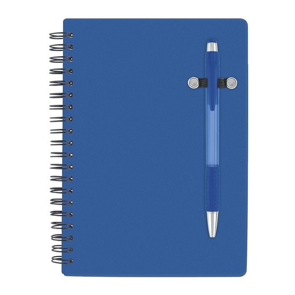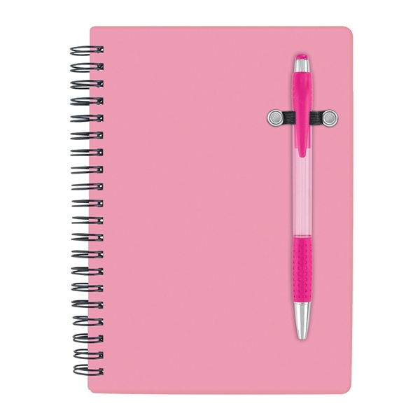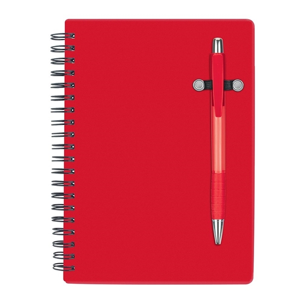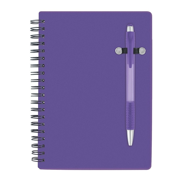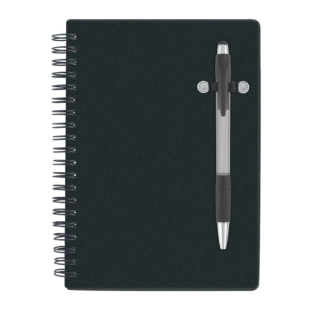 - Spiral bound 70 sheet lined notebook; bright translucent color cover; matching translucent color ballpoint pen.