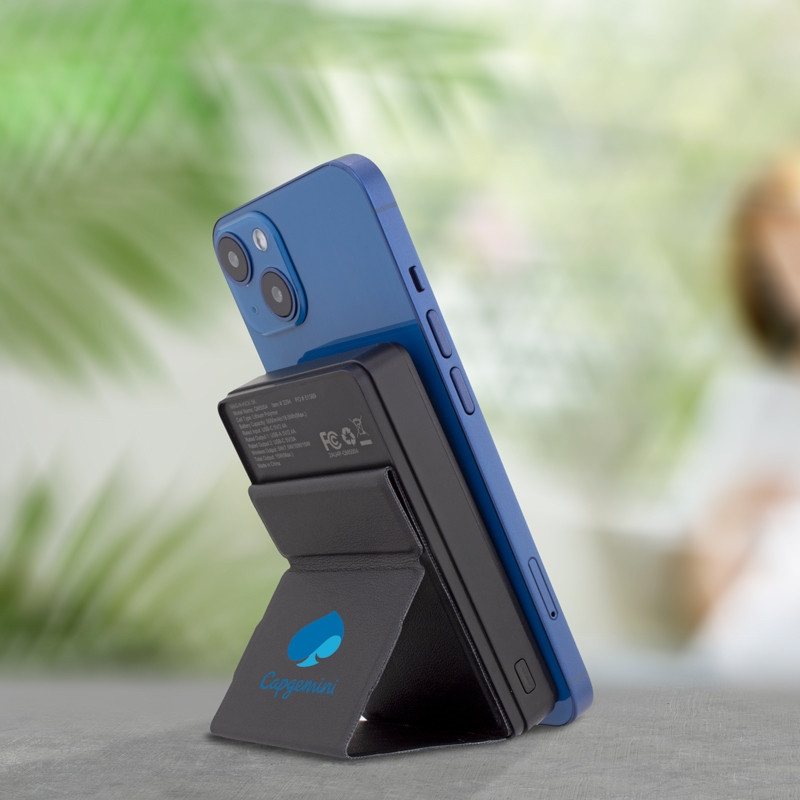 The Energizer® Mag-N-KickTM 5K is a great-looking power bank with 5, 000 mAh battery capacity. Magnetically holds to newer compatible phones. It also has a convenient foldout stand to prop up on a desktop surface to keep your hands free. It's a great device for daily use for any busy professional.Details on making your custom Energizer Mag-N-Kick™ 5K