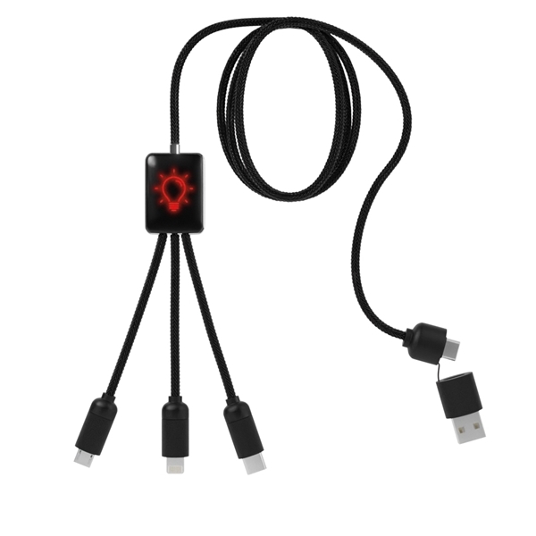 - Make the everyday task of charging your devices a little more fun with an illuminated logo. The dual-input, 3-foot-long cable provides extra reach. As a bonus, the cords are made from RPET material, making this item an eco-conscious choice. Includes a resealable pouch and 3-year warranty. Patent pending.