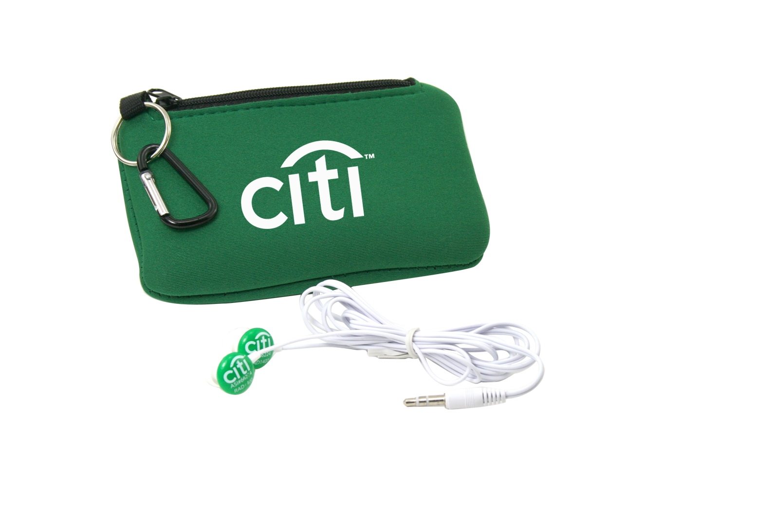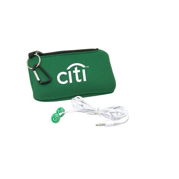 - Button style earbuds inserted into a deluxe smartphone holder with zippered compartment and carabiner.