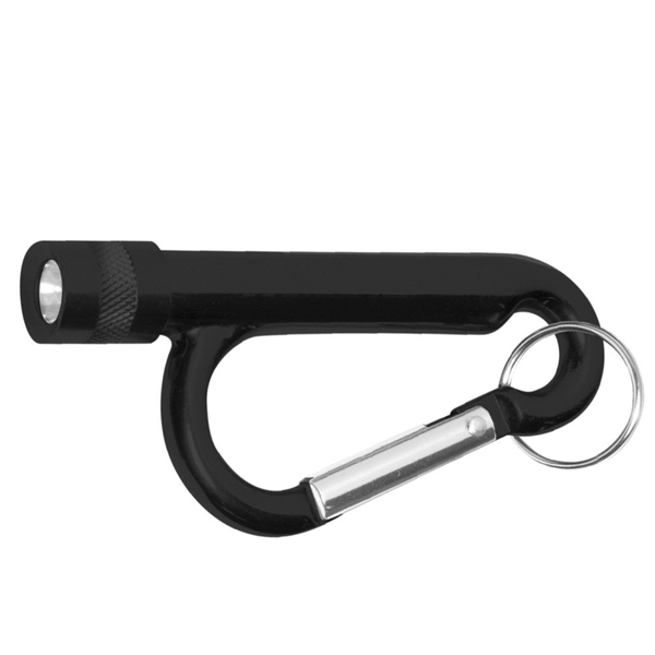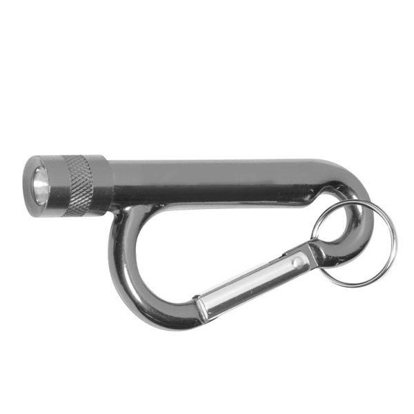 - This metal carabiner features a flashlight and split ring.