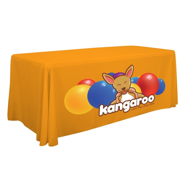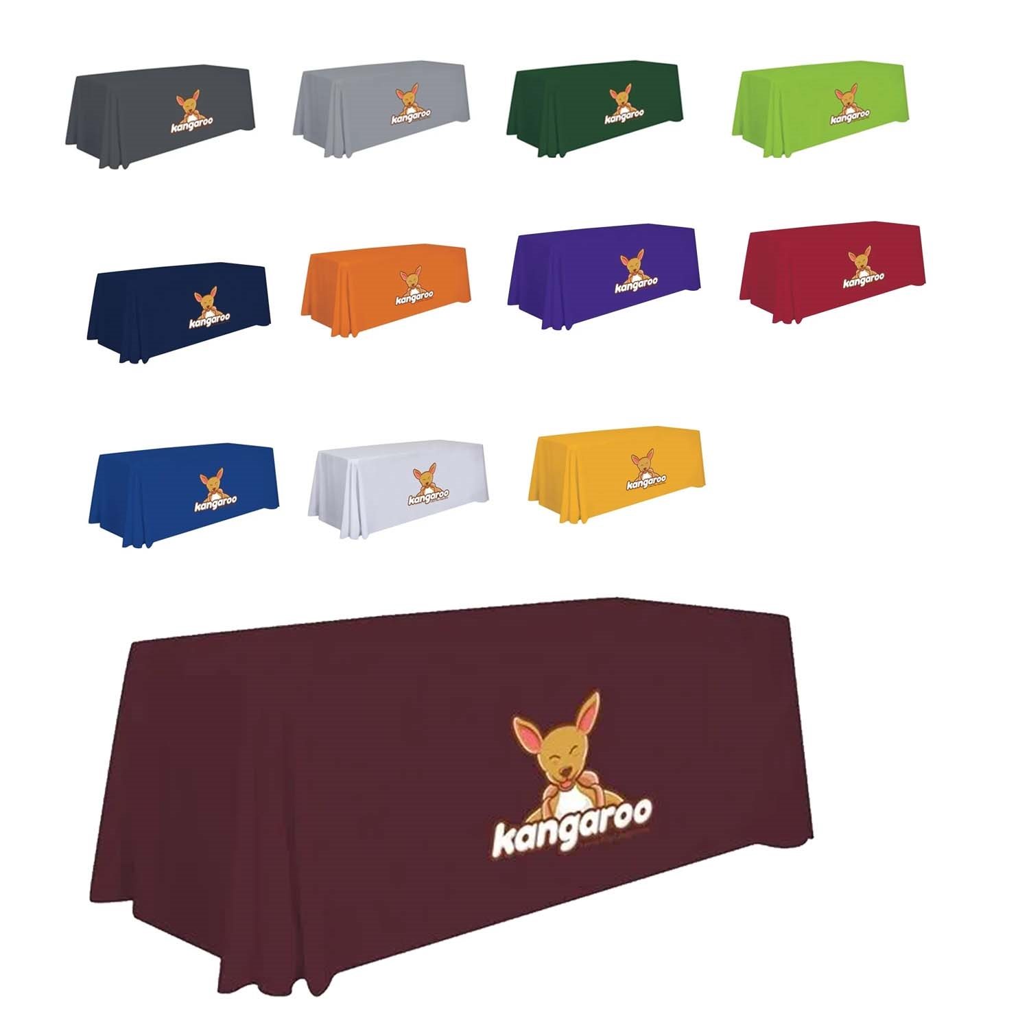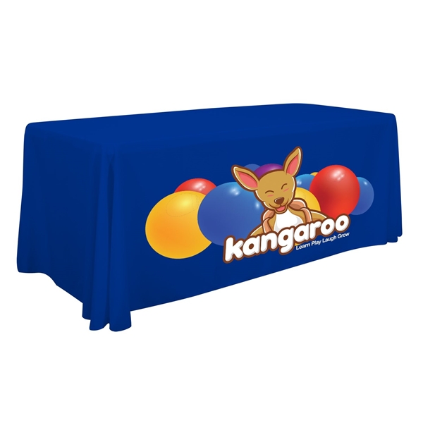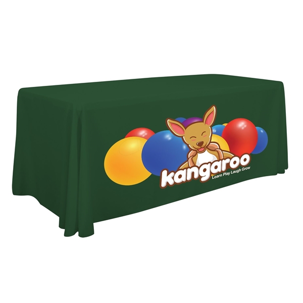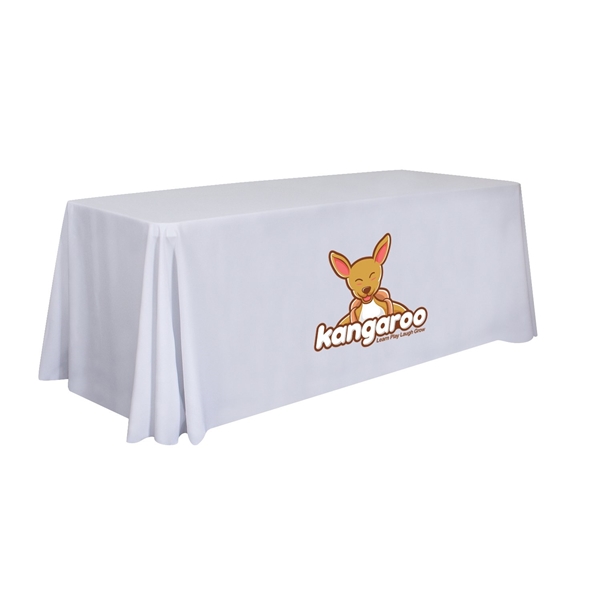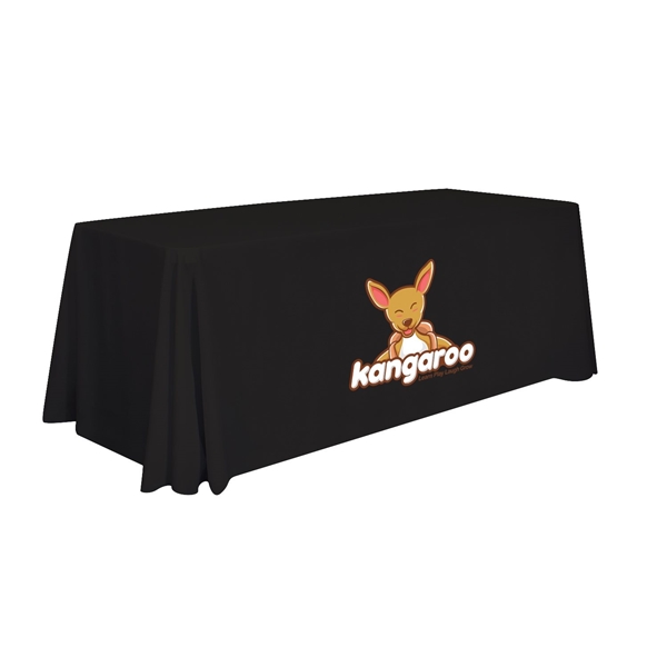 - Front-panel branding: Artwork is imprinted on the front of the table throw so your logo is prominently displayed.