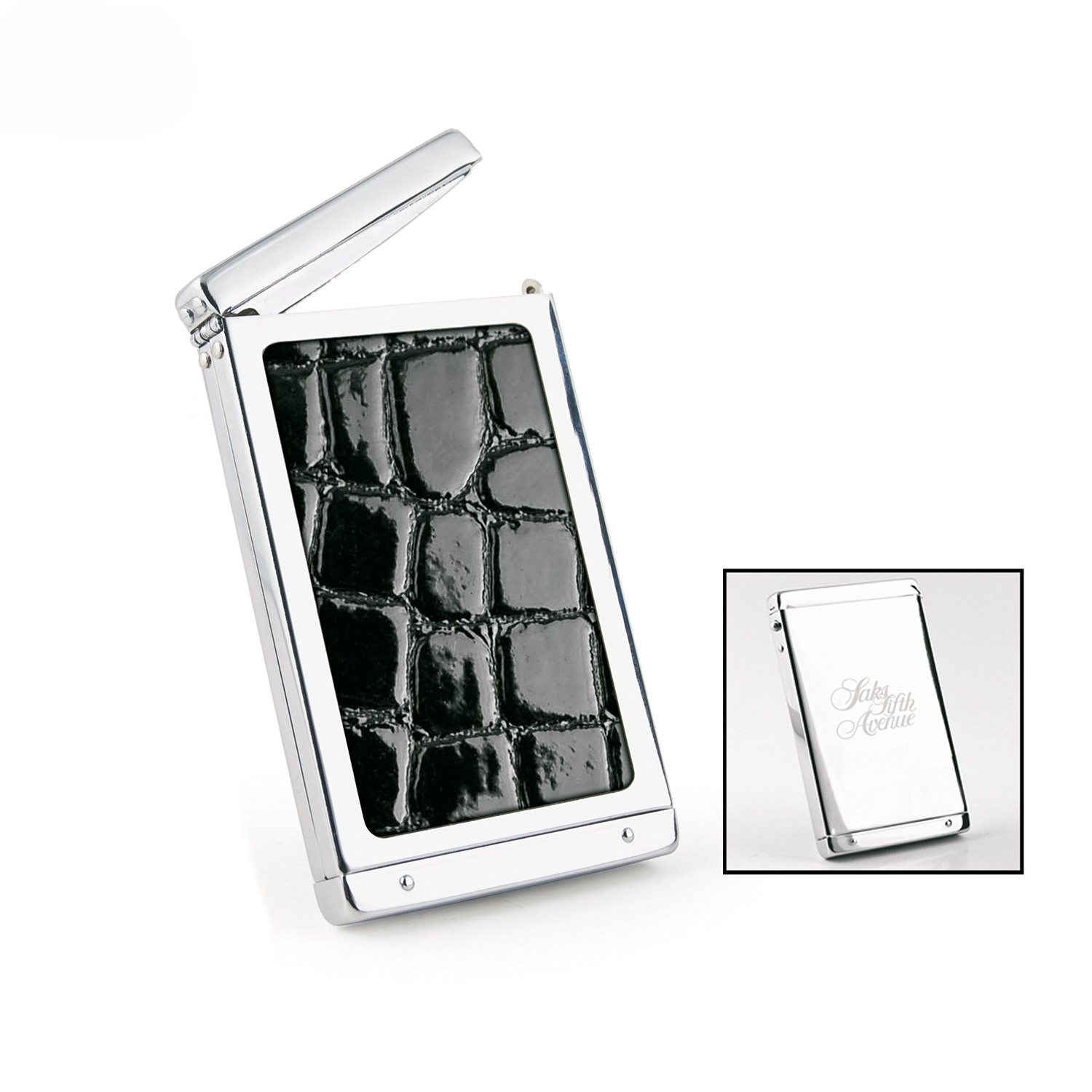 - Business card case in polished chrome with black croco insert.