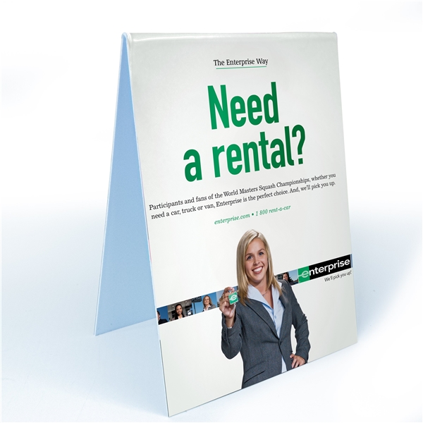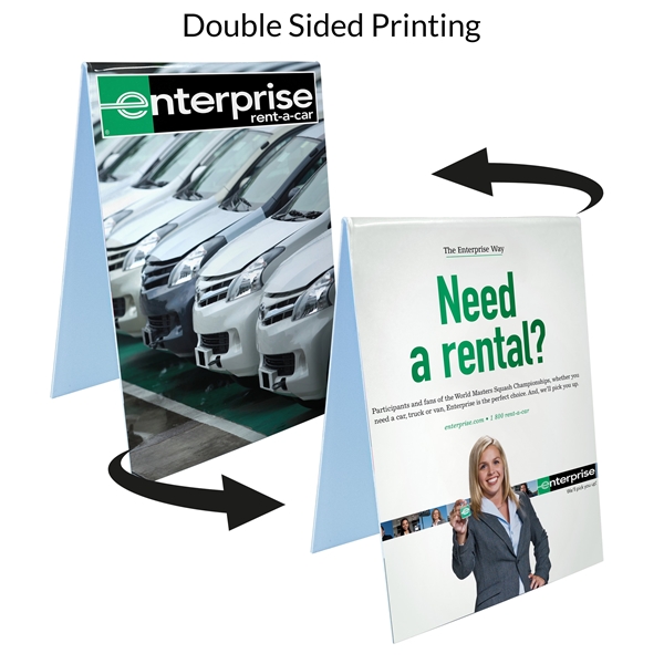 - Easily turn tables and counter space into advertising vehicles with this plastic, full color, self-standing tent sign to promote your brand message or special offer.