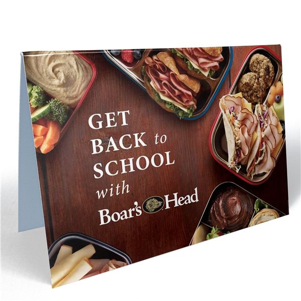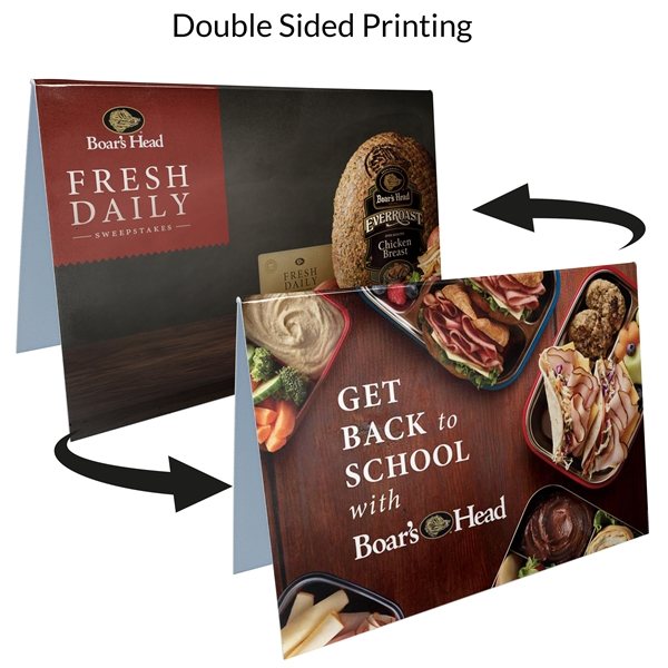 - This plastic, full color, self-standing tent sign serves as a miniature billboard at reception desks, trade shows, retail displays and more.