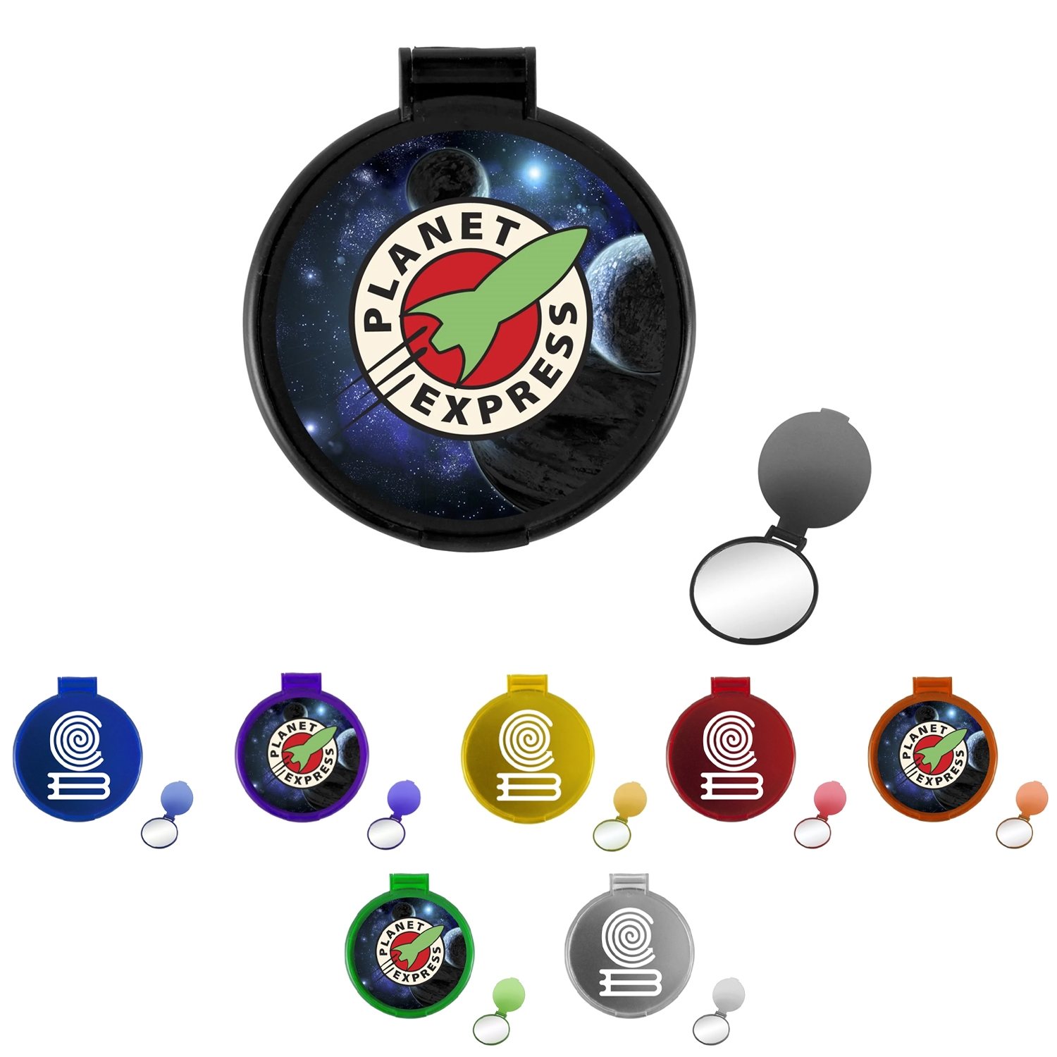 - Measuring 2.4" in diameter, this mirror includes a one color direct print or optional full color process printing.