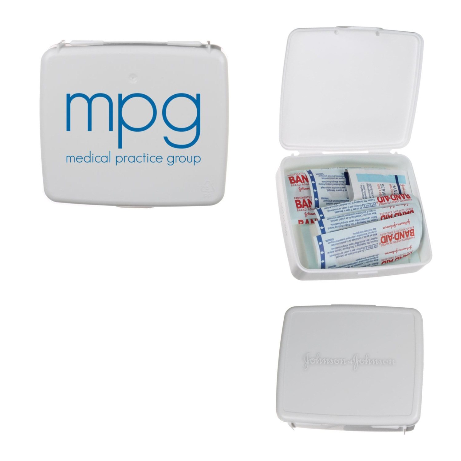 - This first aid kit contains 2x Johnson & Johnson brand hand cleansing wipes, 4x Band-Aid brand sterile gauze pads, 2x Band-Aid brand flexible fabric large bandages, and 4x Band-Aid brand flexible fabric small bandages.