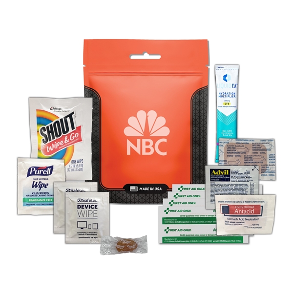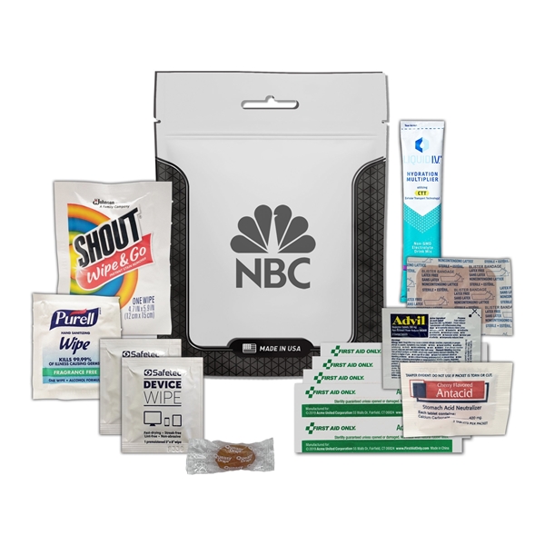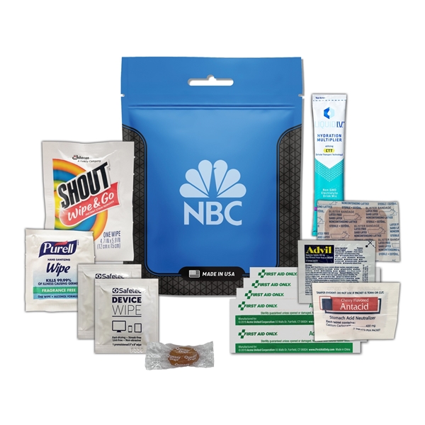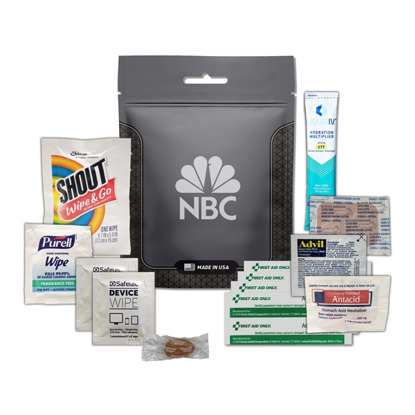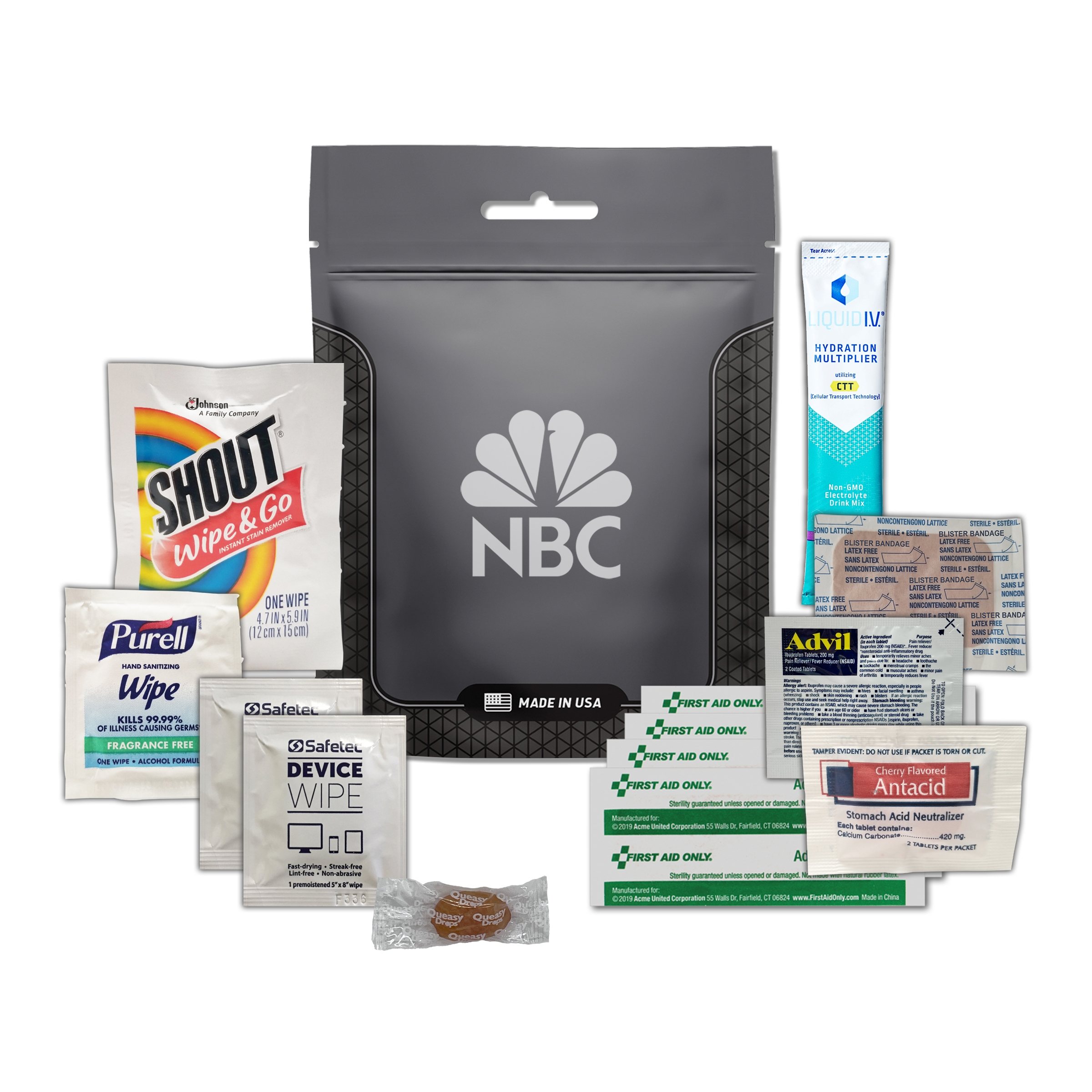 - This kit includes: 1 Liquid IV, 2 Device Cleaning Wipes, 1 Blister Bandage, 1 Antacid, 1 Shout Wipe Stain Remover, 1 Purell Wipe, 1 Advil, 1 Queasy Drop, 4 Bandages