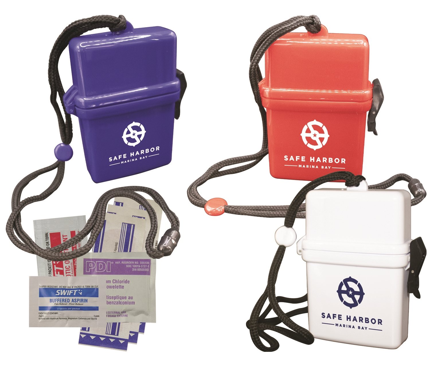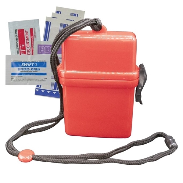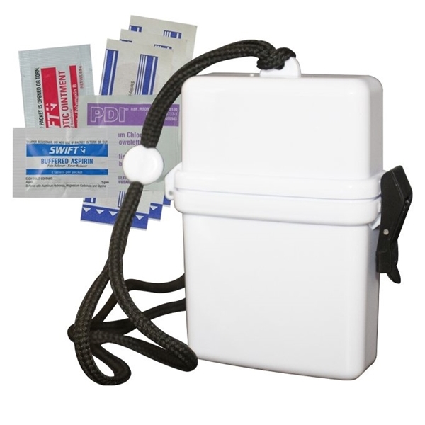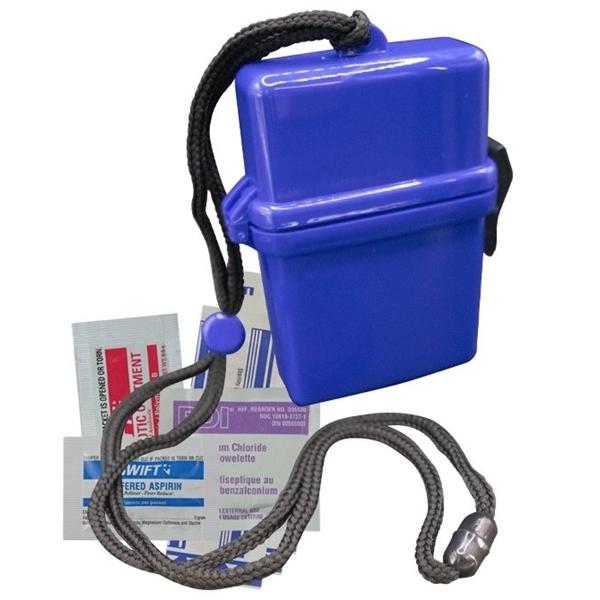 - Features an attached and adjustable, nylon strap; Safety lock lid provides waterproof protection; Contents include: 3 - ¾" x 3" Adhesive Bandages, 1 - Packet Triple- Antibiotic Ointment, 1 - Packet with Two, Buffered Aspirin, 1 - Antiseptic Wipe