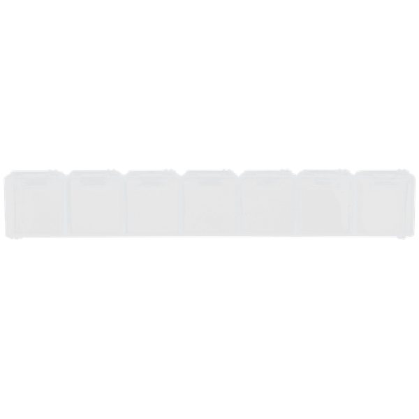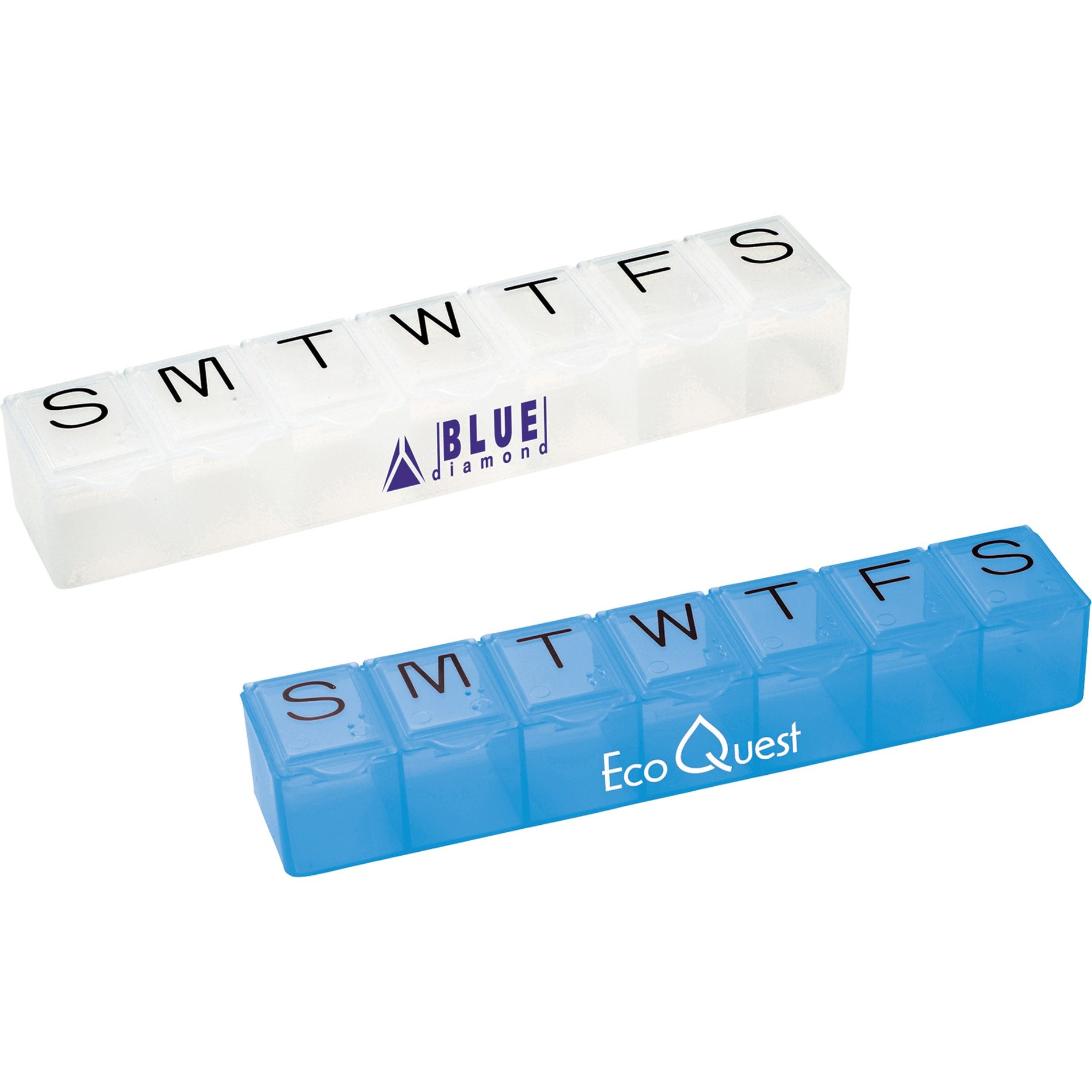 - The 7-Day Pill Case is a storage box that features seven compartments and a conveniently labeled day of the week on the hinged, snap-up lid.